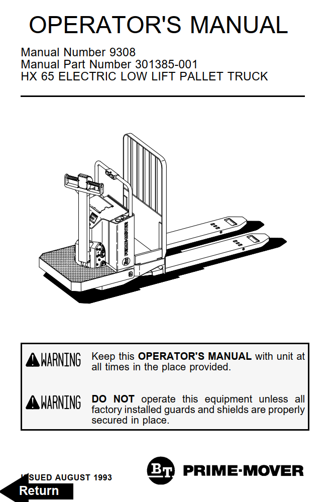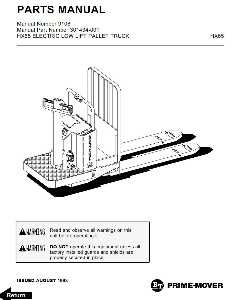 BT PRIME HX65 LOW LIFT PALLET TRUCK SERVICE REPAIR, PARTS, OPERATOR'S MANUAL