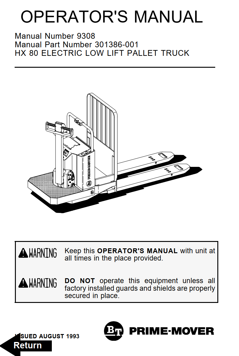 BT PRIME HX80 LOW LIFT PALLET TRUCK SERVICE REPAIR, PARTS, OPERATOR'S MANUAL