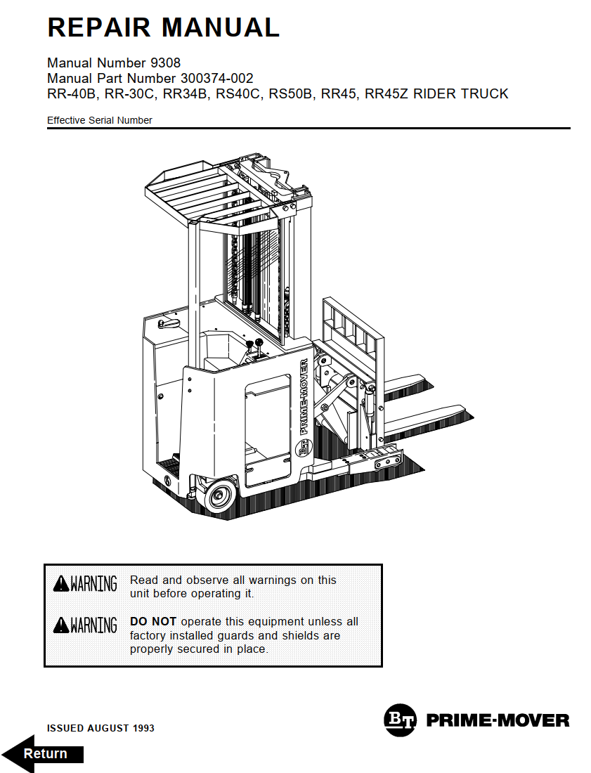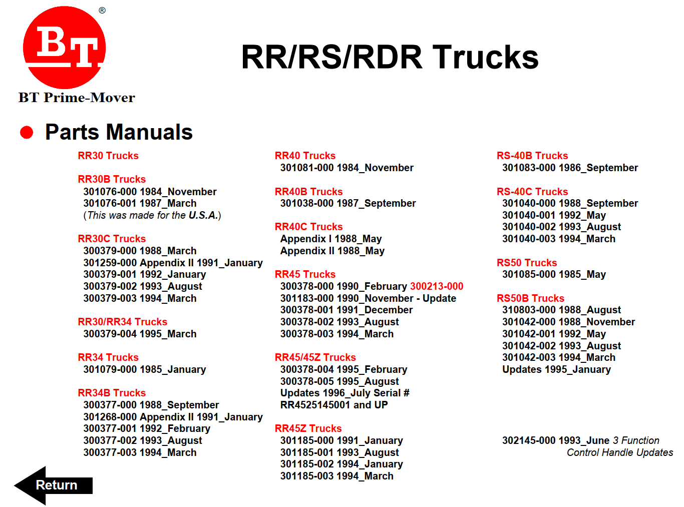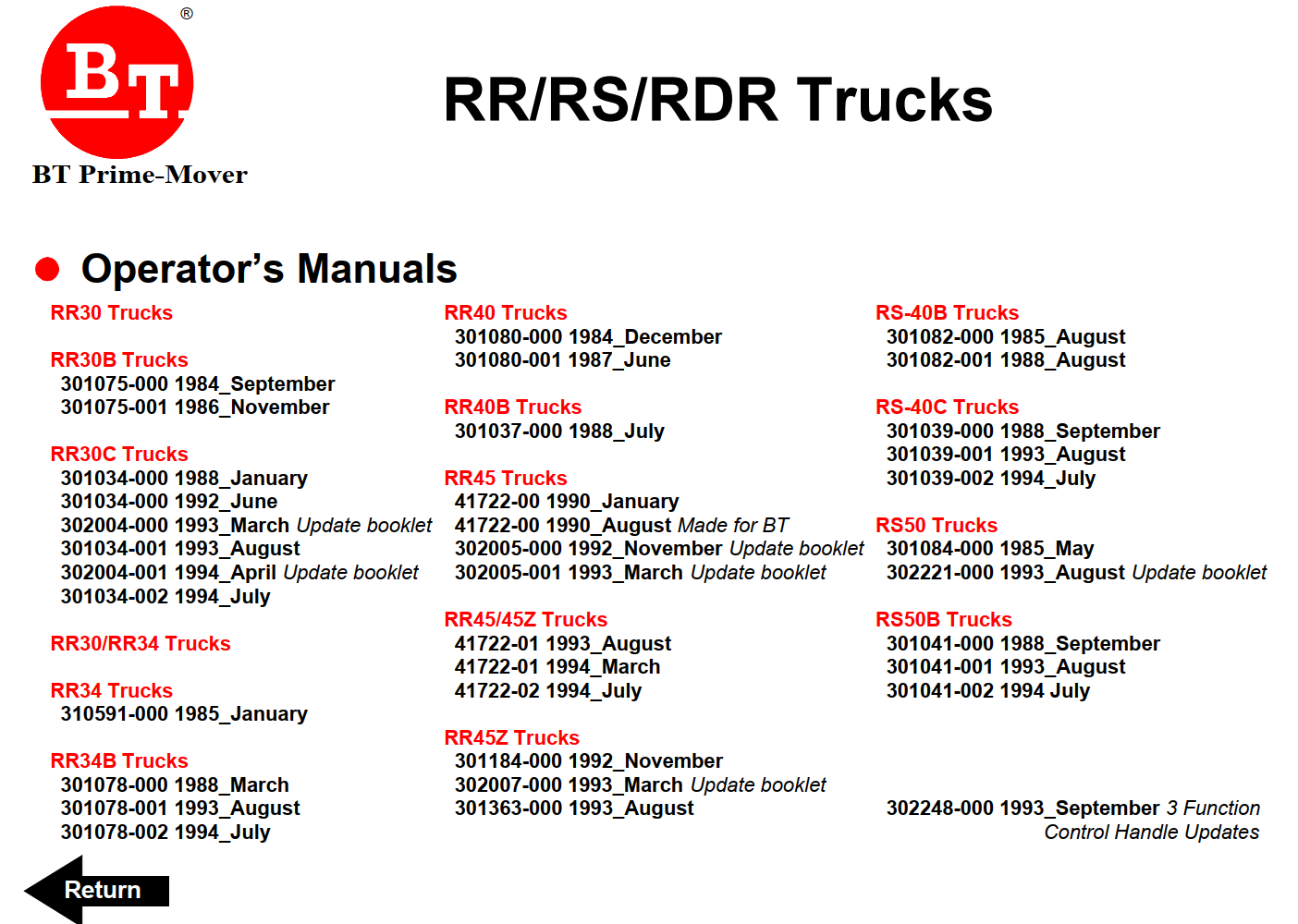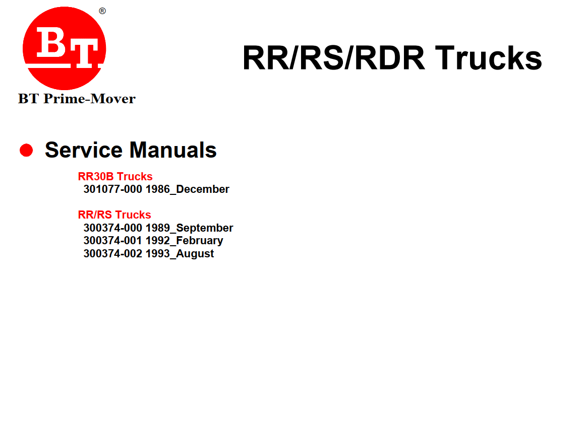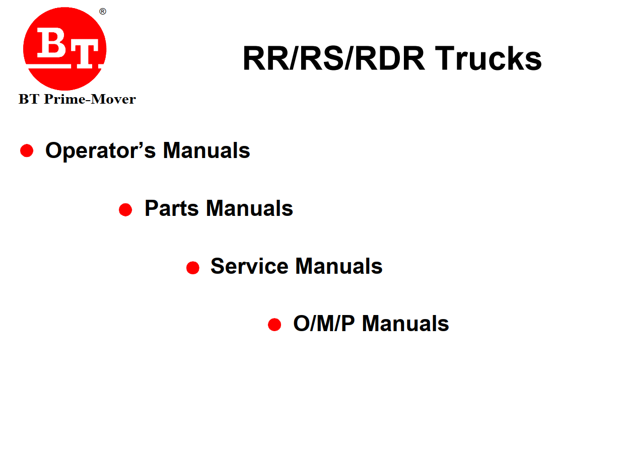 BT RR-40B RR-30B RR-30C RR-34 RR-34B RS-40C RS-50B RR-45 RR-45Z TRUCK FULL SET SERVICE, PARTS, OMP, OPERATOR MANUAL